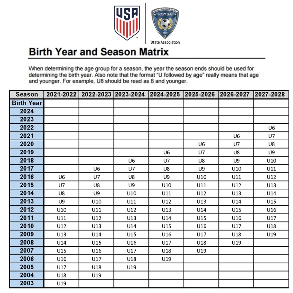 Our league follows the USA Soccer age guidelines for our divisions. A copy of that matrix can also be found in the Riverfront Sports app in the documents section. Please take a look the 2025-2026 column to ensure that all your players are eligible to play in the division your team is in.